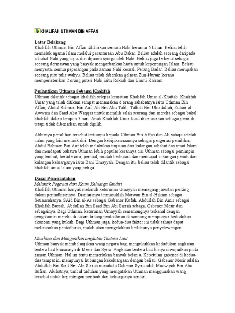 Usianya lima tahun lebih muda dari rasulullah saw. Dia merupakan sosok yang tenang, lembut dan sangat hangat. Khalifah adalah jabatan tertinggi dalam kepemimpinan islam pacsa rasu islamicblog. Select the following files that you wish to download or play stream, if you do not find them, please search only for artist, song, video title. Khalifah usman bin affan dipilih di rusia 70 tahun. Ia dikenal sebagai pedagang kaya raya dan ekonom yang handal namun sangat dermawan. Kebudayaan di masa khalifah utsman bin affan. Beliau juga menantu yang pertama. Utsman bin affan bukan sekedar sahabat rasulullah saw. Nasabnya bertemu dengan nasab rasulullah shallallahu 'alaihi wa sallam pada kakek yang keempat. Menjelang kematiannya, umar menunjuk majelis berisi enam pemimpin yang dihormati masyarakat madinah untuk memilih penerus. Selama itu prestasi yang dicapai utsman bin affan : Waqaf shadaqah jariyah milik utsman bin affan di madinah.