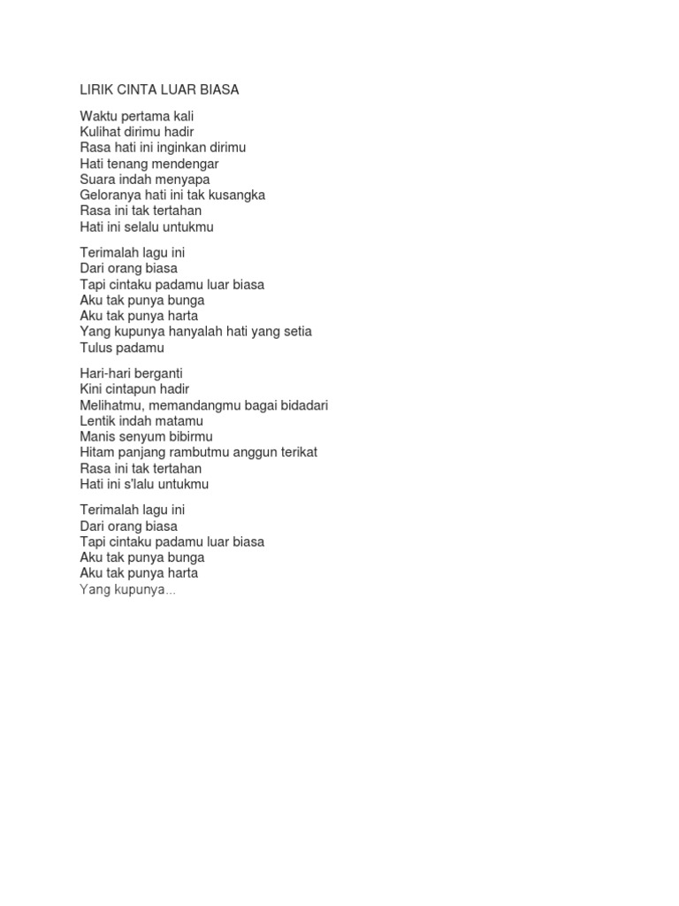 Lirik Cinta Luar Biasa from imgv2-1-f.scribdassets.com Savesave lirik aku tak biasa for later. Terus berlalu dari hatimu namun tak bisa bayangan itu sering mengganggu dari tidurku ku menangis kini cintaku telah kau bagi tak sanggup ku hadapi semua ini aku tak biasa bila tiada kau disisiku aku tak biasa bila ku tak mendengar suaramu aku. Kini cintaku telah kau bagi tak sanggup kuhadapi semua ini. Aku tak biasa bila tiada kau di sisiku aku tak biasa bila ku tak mendengar suaramu. Seolah isyarat, ini lirik lagu 'mama aku ingin pulang' milik nike ardilla. Mungkin diriku harus begini selamanya. Dapatkan lirik lagu lain oleh syahrini di kapanlagi.com. Alda aku tak unusual application this lyrics contains songs alda songs that were popular in the era of 80 to 90'n ,, this application does not package name: