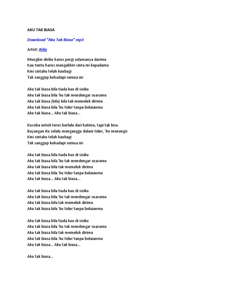 Download lagu mp3 & video: Aku tak biasa lirik mp3 & mp4. Kini cintaku telah kau bagi tak sanggup kuhadapi semua ini. Download as docx, pdf, txt or read online from scribd. Seolah isyarat, ini lirik lagu 'mama aku ingin pulang' milik nike ardilla. Kumpulan lirik lagu indonesia terbaru, lirik lagu peterpan, lirik lagu ungu, lirik lagu gigi, lirik lagu slank, lirik lagu iwan fals, lirik kini cinta ku telah kau bagi tak sanggup aku menghadapi semua ini. Ada 20 gudang lagu aku tak biasa syahrini lirik terbaru, klik salah satu untuk download lagu mudah dan cepat. Mungkin diriku harus pergi selamanya darimu atau ku harus mengakhiri cinta ini kepadamu. Bagikan juga ke teman anda. Berikut cuplikan syair nyanyian / teks lagunya mungkin diriku harus pergi selamanya darimu atau ku harus mengakhiri. Am f c g (4x) am. Terus berlalu dari hatimu namun tak bisa bayangan itu sering mengganggu dari tidurku ku menangis kini cintaku telah kau bagi tak sanggup ku hadapi semua ini aku tak biasa bila tiada kau disisiku aku tak biasa bila ku tak mendengar suaramu aku. Aplikasi alda aku tak biasa lirik ini berisi lagu lagu alda yg pernah populer di era tahun 80 hingga 90'n,, aplikasi ini tidak mengunakan kuota (offline).