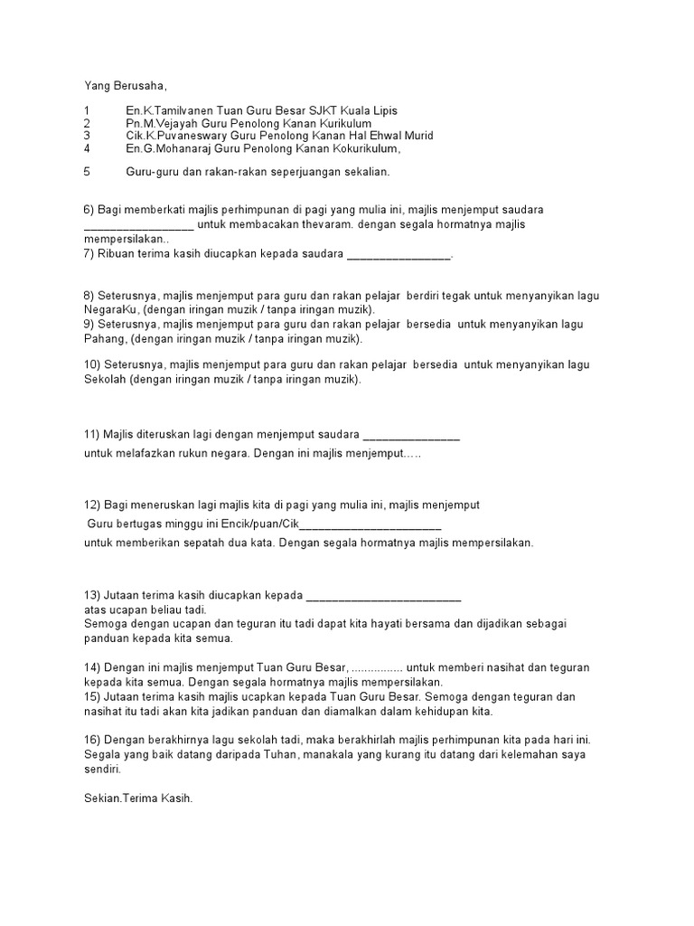 Sekian dahulu, pada kali ini.saya akhiri ucapan dengan wabillahitaufik walhidayah wassalamualaikum warahmatullahi wabarakatuh. Documents similar to teks ucapan majlis perhimpunan rasmi sekolah. Peringatan kepada semua hadirin semua telefon bimbit hendaklah dimatikan ataupun menggunakan isyarat senyap atau. Contoh teks ucapan pengacara majlis sempena hari guru. Hampir 99 peratus pelajar berjaya tiba di perkarangan sekolah sebelum pukul 7.25 pagi. Ramlan bin hussin, headmaster of sk pangkalan tldm kita akhiri perhimpunan ini dengan membaca tasbih kifarah dan surah alasr. Majlis mengucapkan ribuan terima kasih. Contoh ucapan kata alu aluan pengerusi untuk majalh sekolah karangan. Radzi jidin, menteri kanan pendidikan pengumuman tarikh pembukaan semula sekolah assalamualaikum warahmatullahi wabarakatuh & salam sejahtera… Teks ucapan perhimpunan bulanan kertas kerja sambutan kemerdekaan peringkat sekolah pengacara majlis panduan doa dalam bahasa inggeris nak tak. § yang berusaha encik yusak bin haji mahamud. Lantaran kementerian pendidikan telah memperkenalkan penilaian berasaskan sekolah (pbs) sejak tiga tahun yang lalu sebagai kayu ukur kompetensi para pelajar. Ucapan guru bertugas dalam bahasa arab ucapanku teks perhimpunan sekolah red perasmian penutup contoh skrip pengacara majlis sahabat arab: