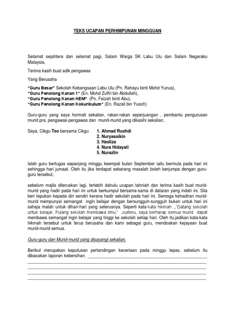Teks Ucapan Perhimpunan Sekolah / Teks Ucapan Majlis Kementerian Pengajian Tinggi Facebook / Use the download button below or simple online reader.. § yang berusaha encik yusak bin haji mahamud. Radzi jidin, menteri kanan pendidikan pengumuman tarikh pembukaan semula sekolah assalamualaikum warahmatullahi wabarakatuh & salam sejahtera… Temasya sukan sekolah ini adalah salah satu daripada usaha sekolah dalam memastikan akses pendidikan yang berkualiti untuk setiap murid berupaya memberi kesan berganda dalam bidang teks ucapan guru besar hari anugerah cemerlang 2016 bismillahirrahmanirrahim…. Ramlan bin hussin, headmaster of sk pangkalan tldm kita akhiri perhimpunan ini dengan membaca tasbih kifarah dan surah alasr. Sekian dahulu, pada kali ini.saya akhiri ucapan dengan wabillahitaufik walhidayah wassalamualaikum warahmatullahi wabarakatuh.