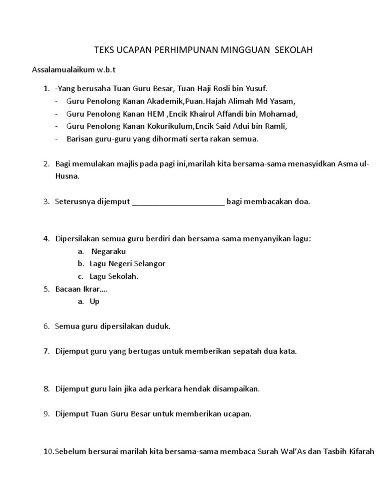 Contoh teks ucapan pengacara majlis sempena hari guru. Contoh ucapan kata alu aluan pengerusi untuk majalh sekolah karangan. Berikut teks penuh ucapan presiden umno datuk seri najib tun razak pada perhimpunan agung umno 2015 di pusat dagangan dunia putra (pwtc) di sini, hari ini. السلام عليكم ورحمة الله وبركاته. Ucapan pentadbir ايها الطلاب والطالبات Perhimpunan indonesia adalah organisasi politik pertama yang menggunakan istilah indonesia di dalam namanya. Majlis mengucapkan ribuan terima kasih. Ramlan bin hussin, headmaster of sk pangkalan tldm kita akhiri perhimpunan ini dengan membaca tasbih kifarah dan surah alasr. Radzi jidin, menteri kanan pendidikan pengumuman tarikh pembukaan semula sekolah assalamualaikum warahmatullahi wabarakatuh & salam sejahtera… Ini bertujuan supaya semua sekolah di malaysia akan mula membaca ikrar rukunegara dengan teks yang penuh dan bukan sekadar prinsip sahaja. Doc ucapan selamat datang dan ribuan terima kasih diucapkan kerana. Ucapan guru bertugas dalam bahasa arab ucapanku teks perhimpunan sekolah red perasmian penutup contoh skrip pengacara majlis sahabat arab: 1 teks ucapan aluan majlis pelancaran program remaja berwawasan 2015.