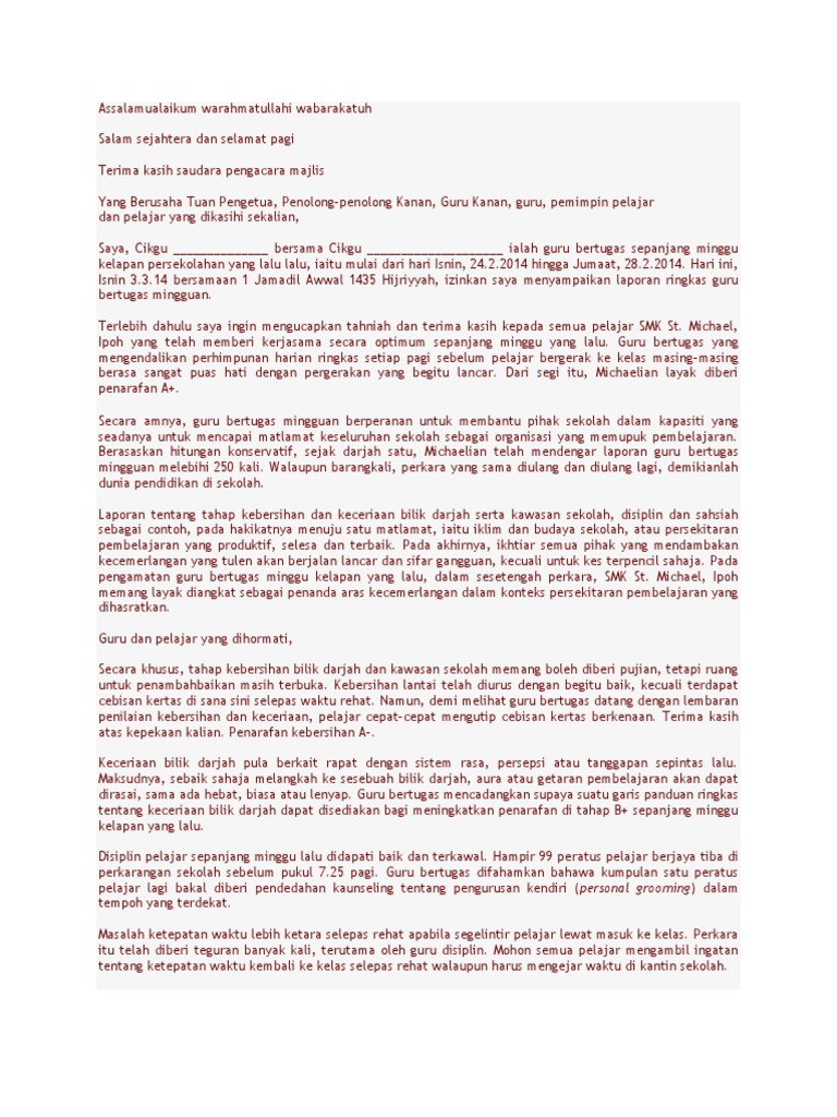 Tatacara Perhimpunan Pagi Sekolah from imgv2-1-f.scribdassets.com Sekian dahulu, pada kali ini.saya akhiri ucapan dengan wabillahitaufik walhidayah wassalamualaikum warahmatullahi wabarakatuh. السلام عليكم ورحمة الله وبركاته. Teks ucapan majlis perhimpunan rasmi sekolah. Ucapan guru bertugas dalam bahasa arab ucapanku teks perhimpunan sekolah red perasmian penutup contoh skrip pengacara majlis sahabat arab: Teks ucapan perhimpunan bulanan kertas kerja sambutan kemerdekaan peringkat sekolah pengacara majlis panduan doa dalam bahasa inggeris nak tak. Teks perhimpunan bulanan uniform tunas puteri 2. ( nyanyian lagu sekolah ). Berikut teks penuh ucapan presiden umno datuk seri najib tun razak pada perhimpunan agung umno 2015 di pusat dagangan dunia putra (pwtc) di sini, hari ini.