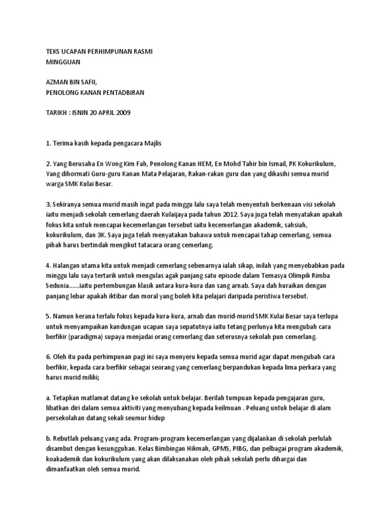 Related : Teks Ucapan Perhimpunan Sekolah / Teks Ucapan Majlis Kementerian Pengajian Tinggi Facebook / Use the download button below or simple online reader..